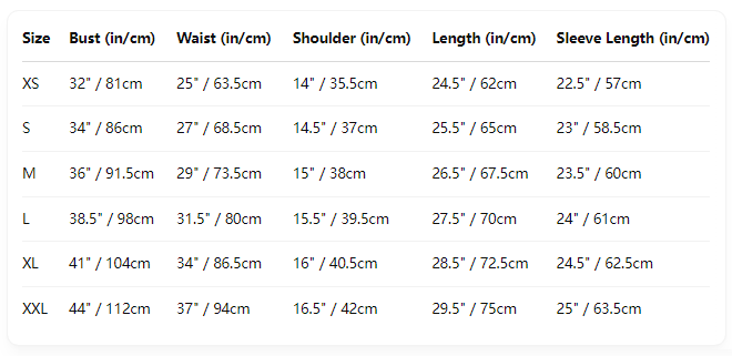 Size: XS, S, M, L, XL, XXL